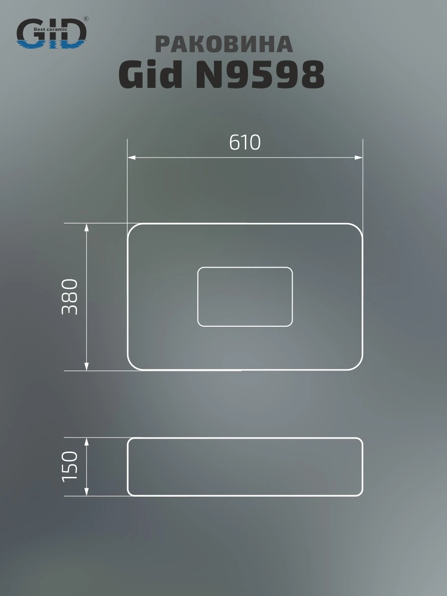 Ссылка на фотографию на белом фоне (https://cloud.mail.ru/public/4zTL/E4xsF7iJ7) — Ссылка на инструкции и схемы (https://gid.com.ru/d/rakovina_https://cloud.mail.ru/public/2AMK/7c9B83oNB_3.jpg) — Серия Geometrico с прямоугольной формой: стиль и практичность с испанским качеством и европейскими стандартами. Накладная раковина GiD N9598 — сочетание элегантного дизайна и практичности для вашей ванной комнаты. Изготовлена из мелкопористой керамики с белым глянцевым покрытием, она придаст интерьеру свежесть и утонченность. Прямоугольная форма обеспечивает оптимальное пространство для комфортного использования. Отсутствие отверстия под смеситель подчеркивает минималистичный стиль, а накладной способ монтажа на столешницу облегчает установку и позволяет создать современный облик ванной комнаты.