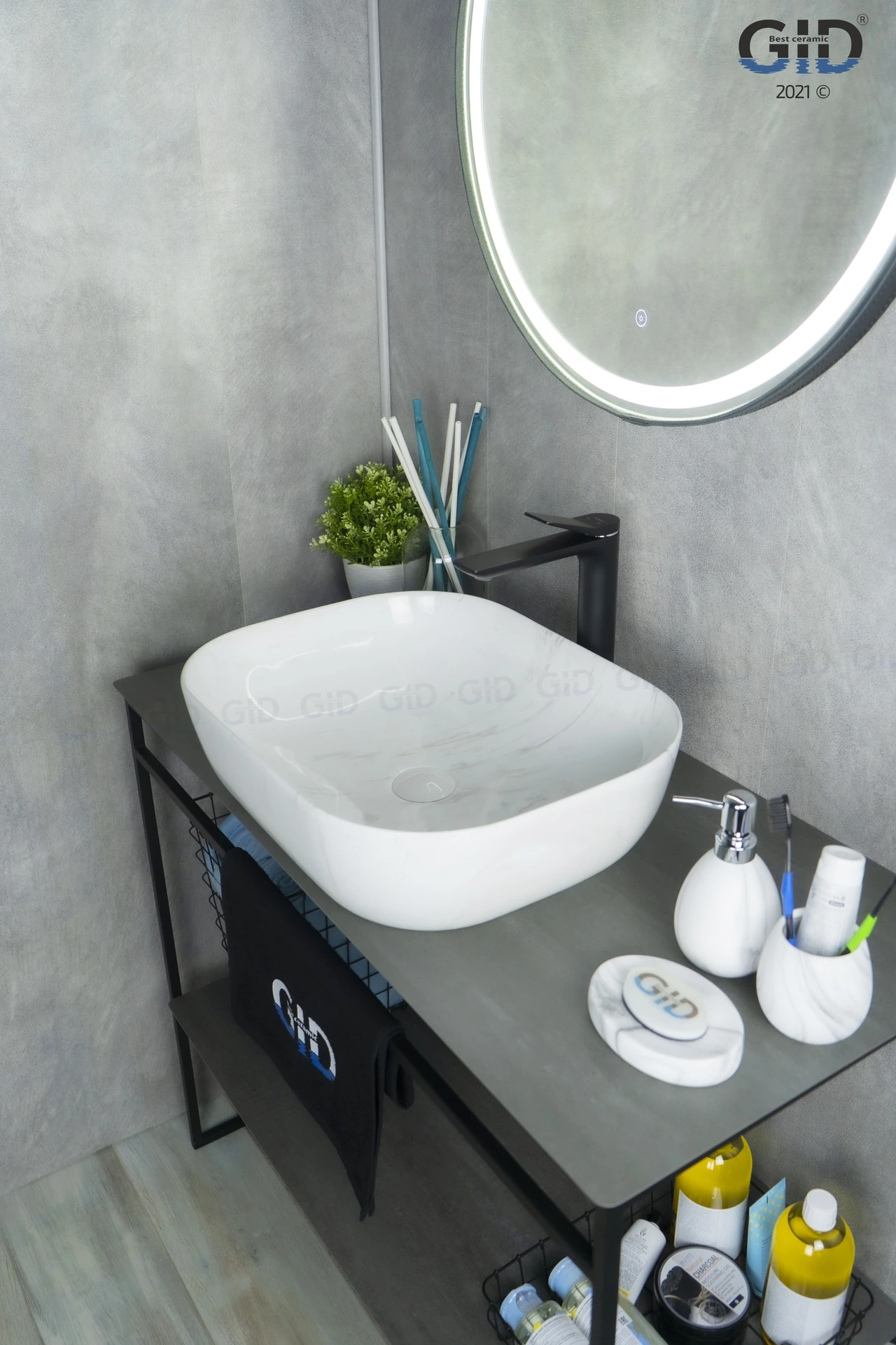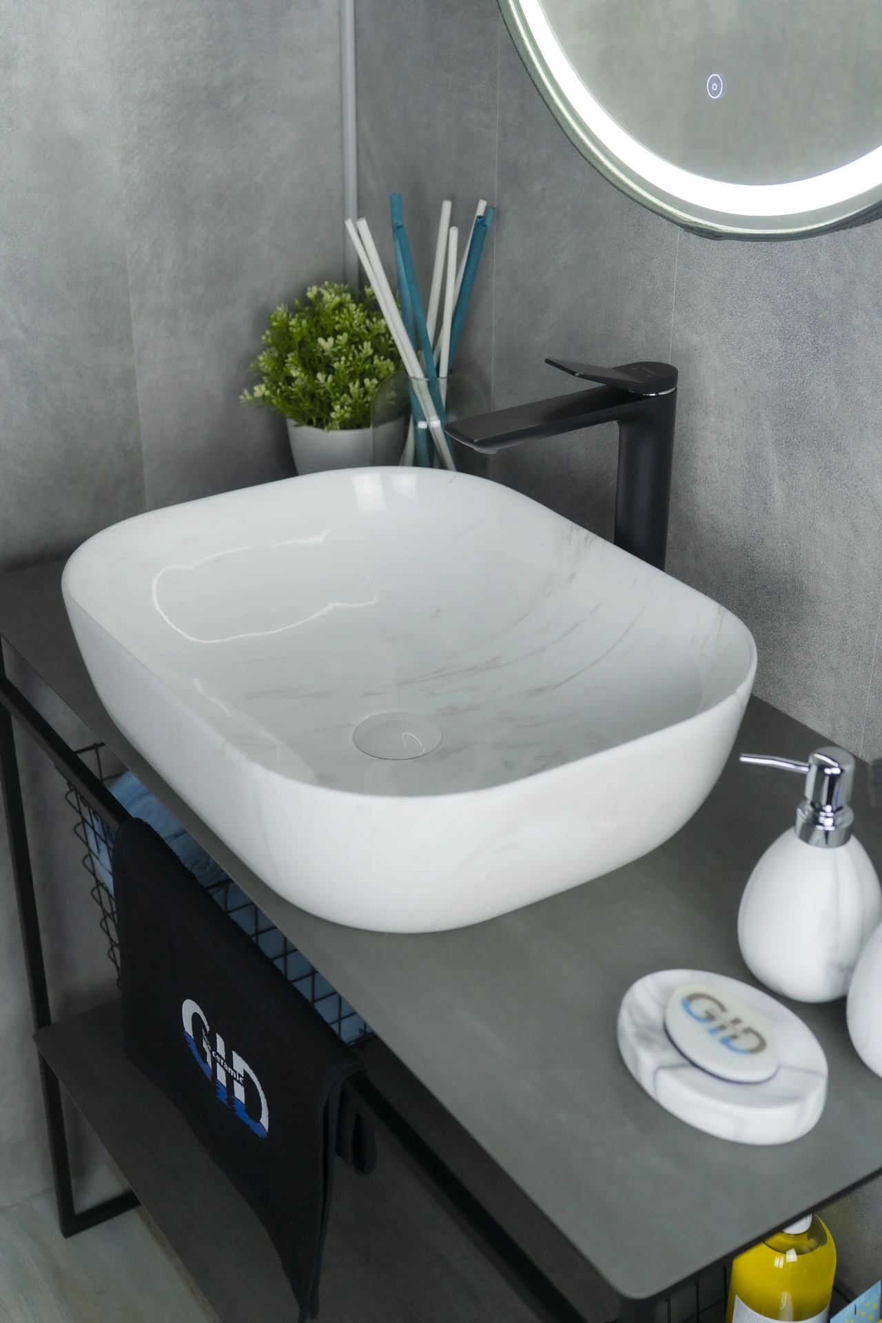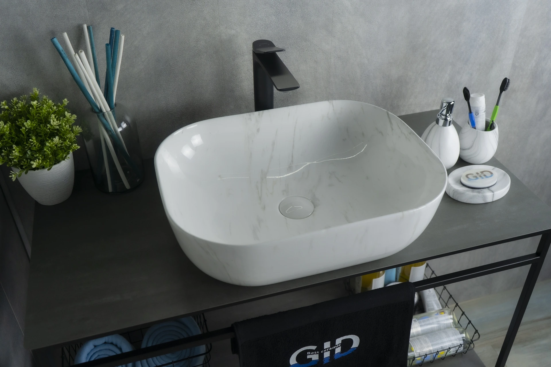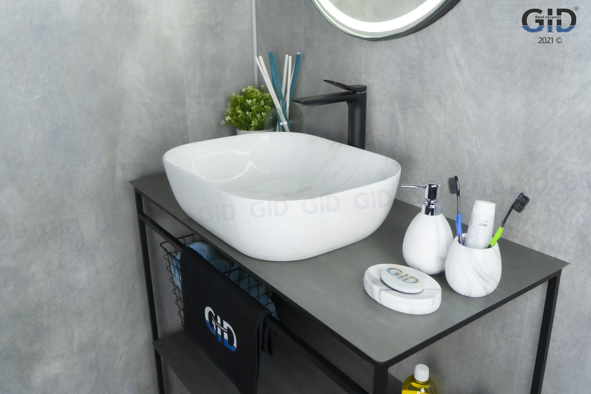 Ссылка на фотографию на белом фоне (https://cloud.mail.ru/public/E3pY/PrXxLUuqP) — Ссылка на инструкции и схемы (https://cloud.mail.ru/public/fdHv/aRsajxETG) — Серия Geometrico с прямоугольной формой: стиль и практичность с испанским качеством и европейскими стандартами. Раковина накладная GiD K397D9— элегантная модель прямоугольной формы, изготовленная из высококачественной керамики с глянцевой поверхностью в белом цвете, создающей эффект натурального камня. Её строгий и современный дизайн идеально подойдёт для ванных комнат в минималистичном или современном стиле. Модель не имеет отверстия под смеситель, что позволяет использовать различные варианты настенных или встраиваемых смесителей, предоставляя свободу в дизайне интерьера. Раковина предназначена для установки на столешницу, подчёркивая стильный и функциональный интерьер ванной комнаты.