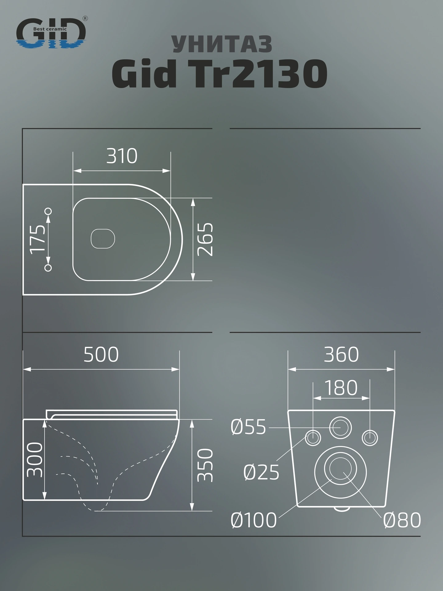Ссылка на фотографию на белом фоне (https://cloud.mail.ru/public/YpSj/8BnRHJdUT) — Ссылка на инструкции и схемы (https://cloud.mail.ru/public/ceAH/MiBRU2DiX) — Cortado — стильная коллекция округлых унитазов и биде со скосом к низу. Испанское качество гарантирует надежность, а европейская сертификация подтверждает их качество. Подвесной безободковый унитаз GiD Tr2130 - модель с горизонтальным выпуском выполнена из мелкопористой керамики в белом глянцевом цвете. Оснащена быстросъёмным сиденьем из дюропласта с функцией микролифта, обеспечивающей плавное и бесшумное опускание крышки. Благодаря антигрязевому покрытию и воронкообразной овальной чаше унитаз обеспечивает высокий уровень гигиены и легкость ухода. Комплект: подвесной унитаз GiD Tr2130 с креплениями для скрытого монтажа; сиденье с креплениями.