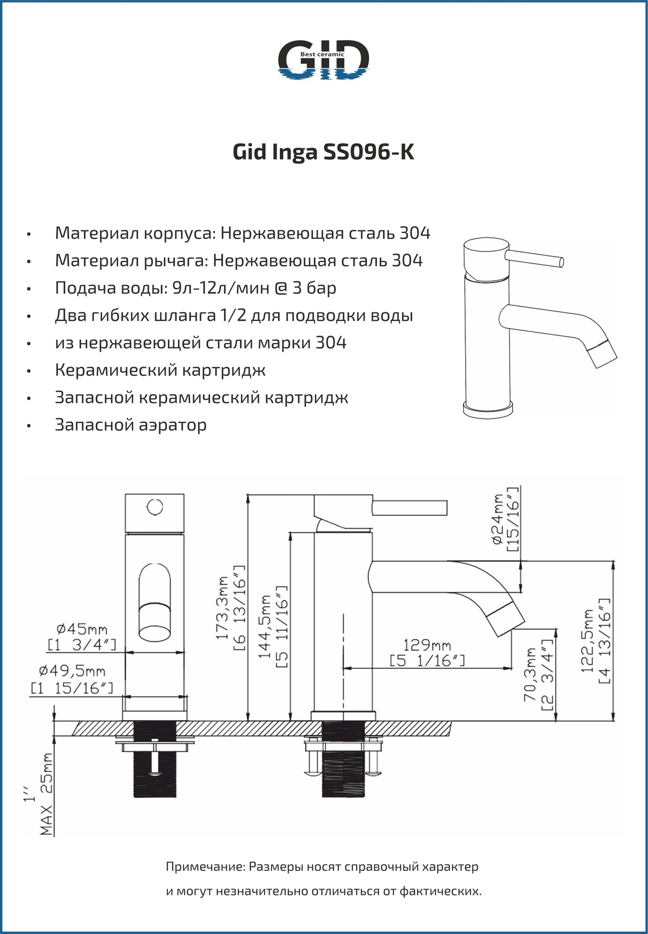 Ссылка на фотографию на белом фоне (https://gid.com.ru/d/ss096-ch-k_1.jpg) — Ссылка на инструкции и схемы (https://gid.com.ru/d/inga_ss096-k.jpg) — Cascada – Смелый дизайн и нестандартные формы сочетаются с испанским качеством и европейскими стандартами. Эти смесители превращают каждый поток воды в динамичное произведение искусства. Смеситель GID Inga SS096-CH-K —короткая модель в стильном хромированном цвете, созданная для раковин в современных ванных комнатах. Изготовленный из высококачественной нержавеющей стали, он отличается долговечностью и устойчивостью к коррозии. Название «Inga» отсылает к знаменитому водопаду Инга на реке Конго — одному из крупнейших водопадов мира, известному своей мощью и стремительным потоком воды. Эта модель воплощает энергию и силу природы, сочетая функциональность с элегантным дизайном. Комплект: смеситель Inga SS096-CH-K; 2 шланга подачи воды, дополнительные аэратор и керамический картридж; шестигранный ключ.