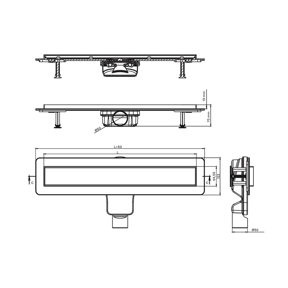 • Комплект • Корпус желоба из пластика, с металлическим обрамлением бортика из нержавеющей стали • Двухсторонняя решетка из нержавеющей стали AISI 304 • Комбинированный затвор • S-образный самопромывной сифон • Горизонтальный выпуск D50 H60, пропускная способность 48 л/мин, монтаж 360° • Регулируемые по высоте ножки • Самоклеящаяся гидроизоляционная мембрана • Сетка для волос • Ключ для решетки
