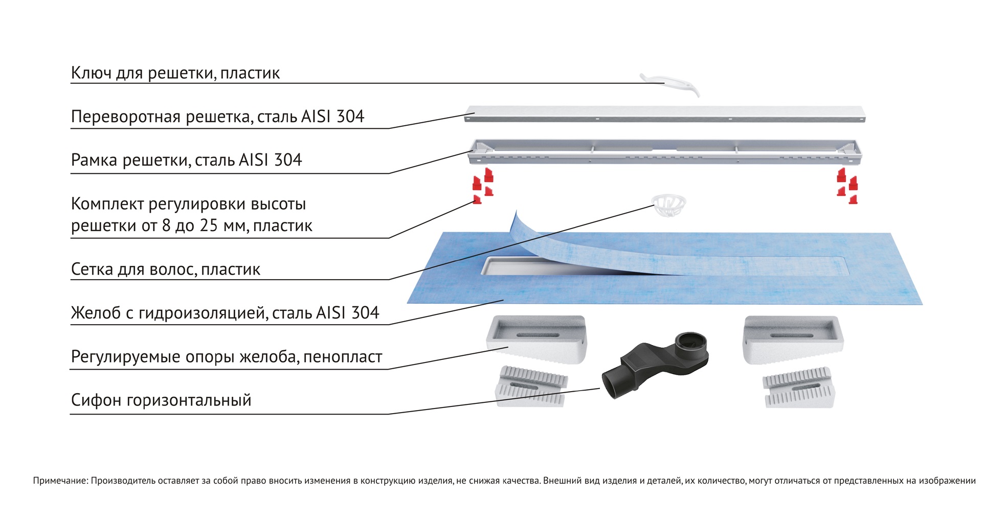 • Комплект Решетка и рамка, нержавеющая сталь AISI 304 Двусторонняя установка решетки: металл и вклейка плитки с регулировкой по высоте от 8 до 25мм Сетка для волос, пластик Желоб водосток, нержавеющая сталь AISI 304, с интегрированной гидроизоляцией Регулируемые по высоте ножки, пенопласт Самопромывной S-образный сифон, полипропилен Горизонтальный выпуск D50 H60, пропускная способность 48л/мин, монтаж 360° Монтажный ключ, пластик