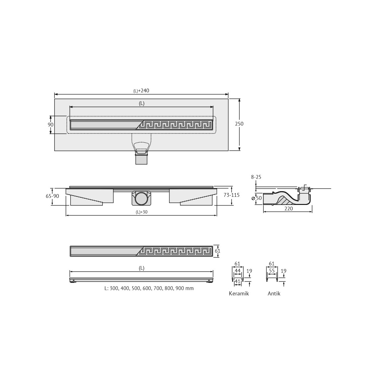 • Комплект Решетка и рамка, нержавеющая сталь AISI 304 Двусторонняя установка решетки: металл и вклейка плитки с регулировкой по высоте от 8 до 25мм Сетка для волос, пластик Желоб водосток, нержавеющая сталь AISI 304, с интегрированной гидроизоляцией Регулируемые по высоте ножки, пенопласт Самопромывной S-образный сифон, полипропилен Горизонтальный выпуск D50 H60, пропускная способность 48л/мин, монтаж 360° Монтажный ключ, пластик