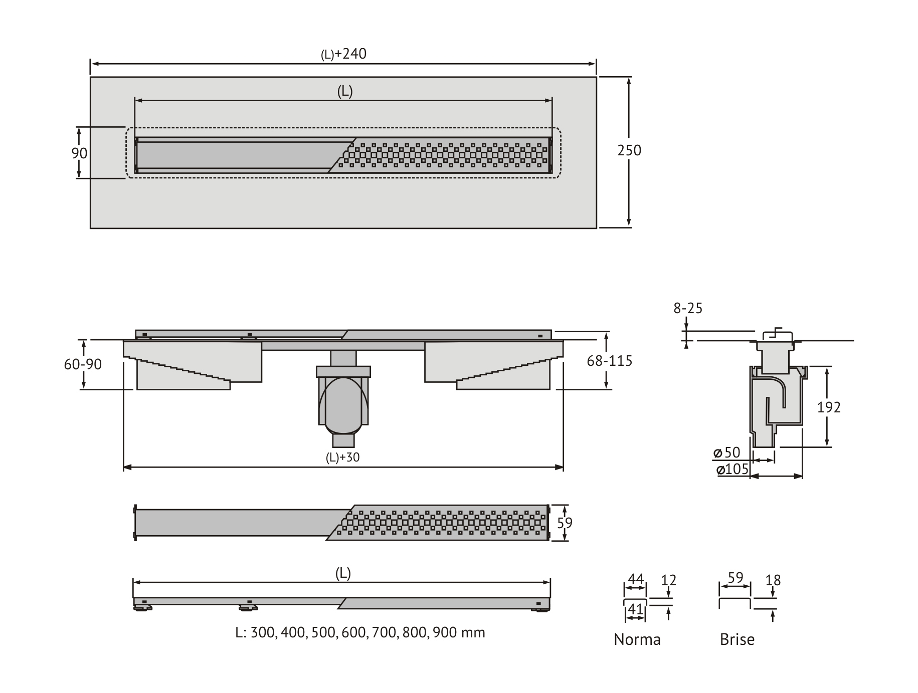 • Комплект Решетка, нержавеющая сталь AISI 304 Фиксирующие кронштейны для переворота решетки под вклейку плитки, пластик Комплект регулировки высоты решетки от 8 до 25 мм, пластик Сетка для волос, пластик Монтажные вставки, металл Желоб водосток, нержавеющая сталь AISI 304, с интегрированной гидроизоляцией Регулируемые по высоте ножки, пенопласт Самопромывной S-образный сифон, полипропилен Вертикальный выпуск, пропускная способность 48л/мин, монтаж 360° Монтажный ключ, пластик