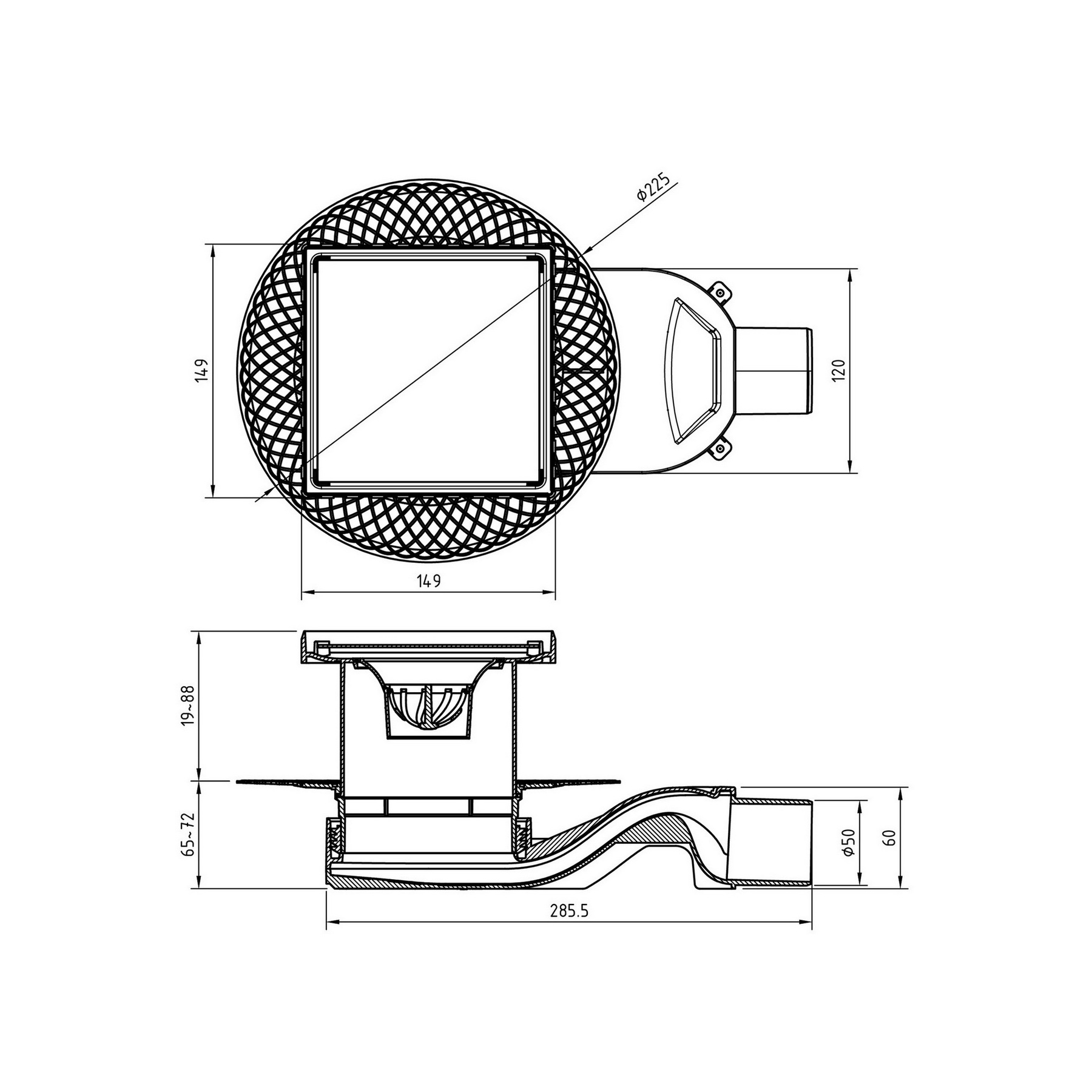 горизонтальный выпуск D50 H60, пропускная способность 42л/мин, монтаж 360°