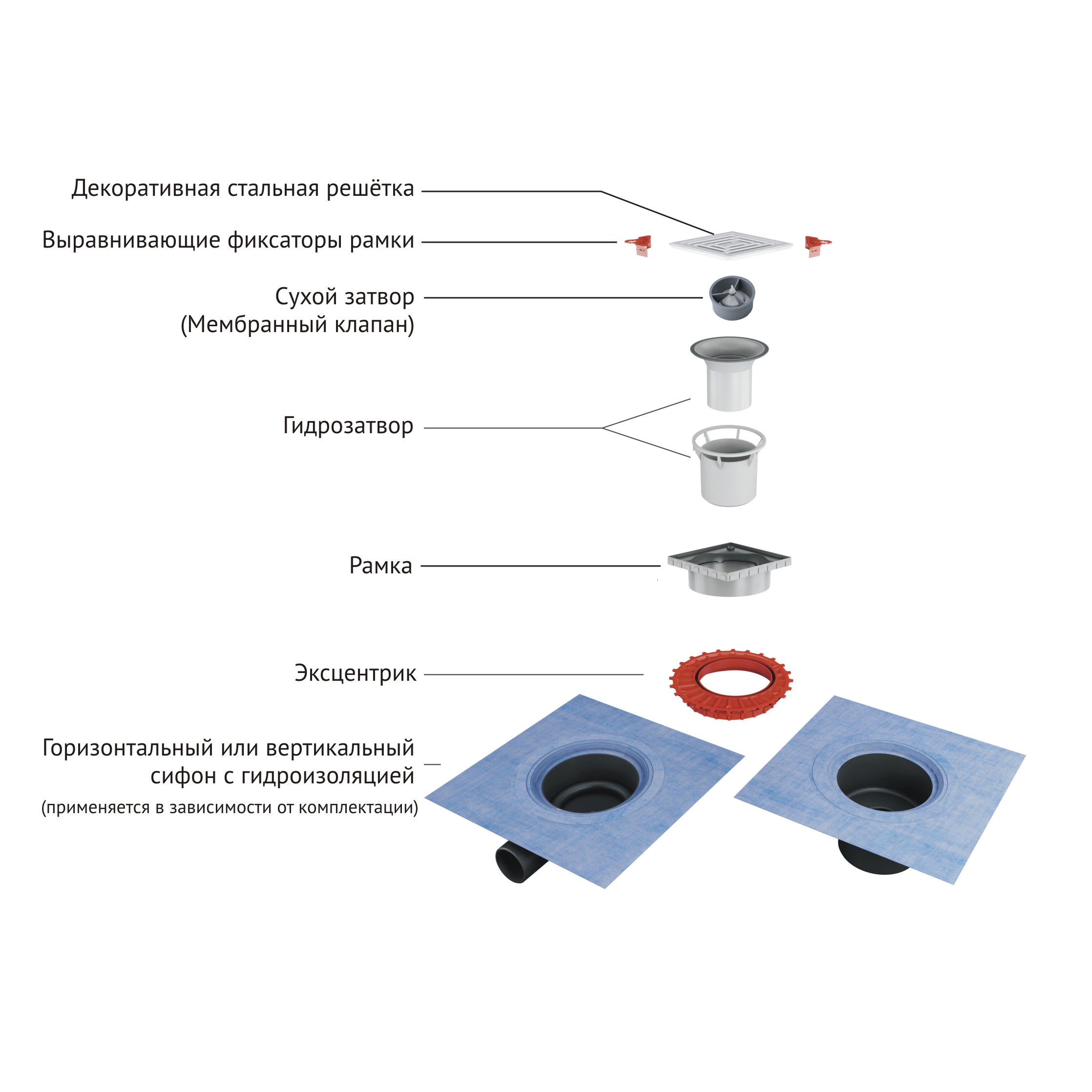 • Корпус трапа с интегрированной гидроизоляционной мембраной, гарантирующей герметичность.