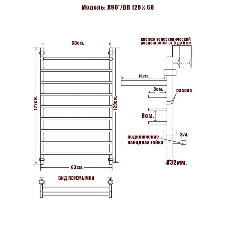 Полотенцесушитель водяной Ника QVADRO 63x122 Л 90 ВП 120/60 хром