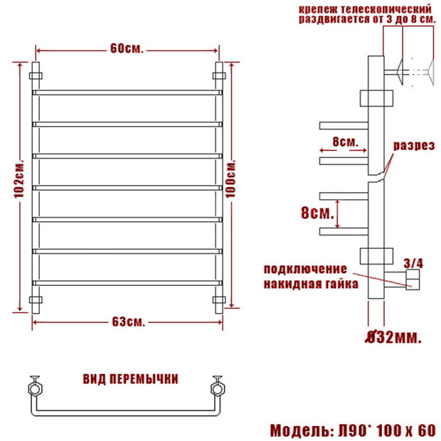 Полотенцесушитель водяной Ника QVADRO 63x102 Л 90 100/60 хром