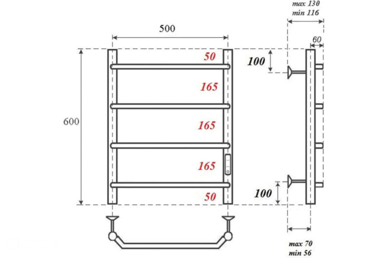 • Межосевое расстояние полотенцесушителя, мм: 500