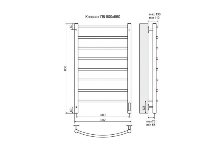 - Межосевое расстояние полотенцесушителя, мм: 500