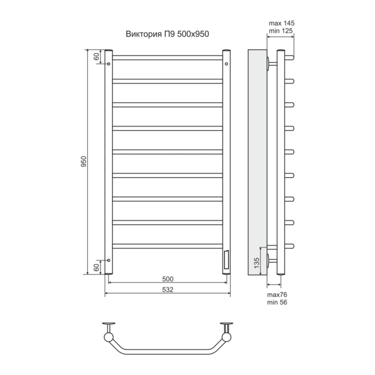 Электрический полотенцесушитель из нержавеющей стали. 9 перекладин.