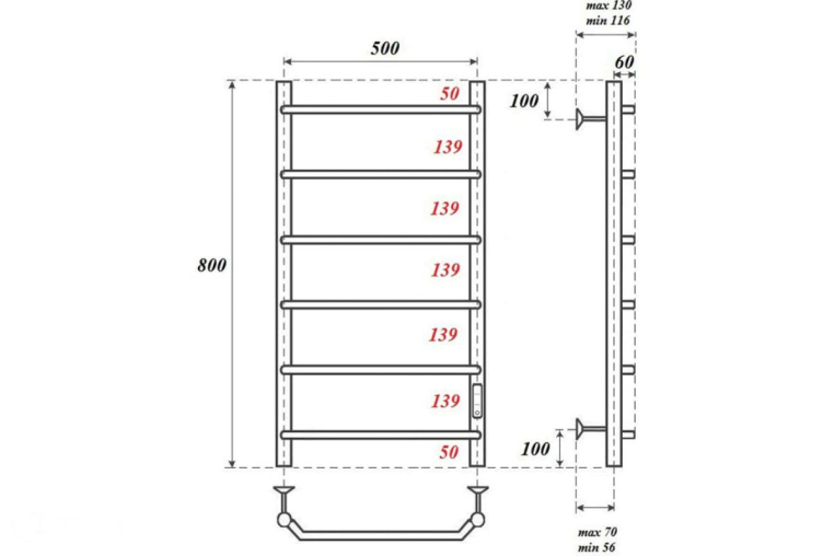 • Межосевое расстояние полотенцесушителя, мм: 500