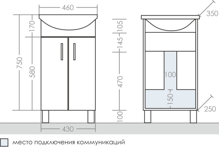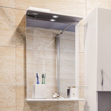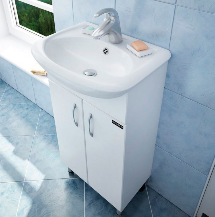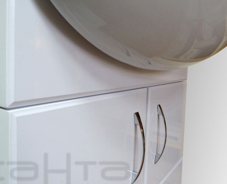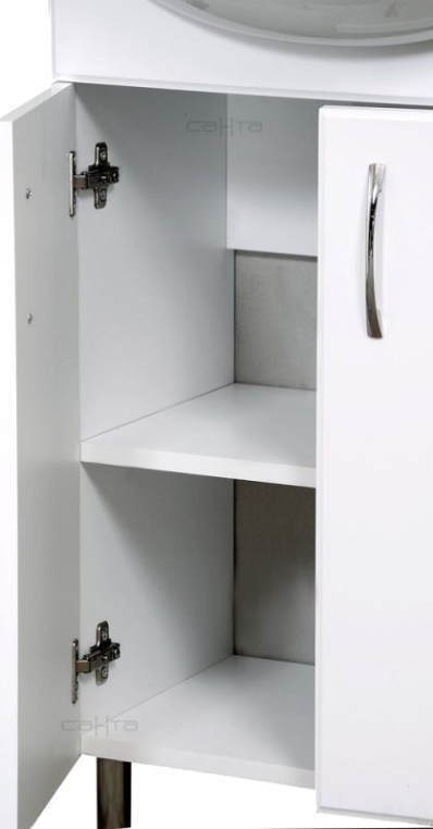 Мебель для ванной СанТа Уют 45 – комплект из зеркального шкафа и тумбы с фаянсовой раковиной. Тумба с двумя распашными дверцами имеет вместительную систему хранения, разделенную полкой. Опорные прорезиненные ножки не скользят и могут регулироваться по высоте в пределах 99–115 мм. Зеркало-шкаф дополнено подсветкой, розеткой и открытой полочкой для размещения средств гигиены. Для защиты от влаги МДФ-фасады мебели покрыты ПВХ-пленкой методом мембранно-вакуумного прессования