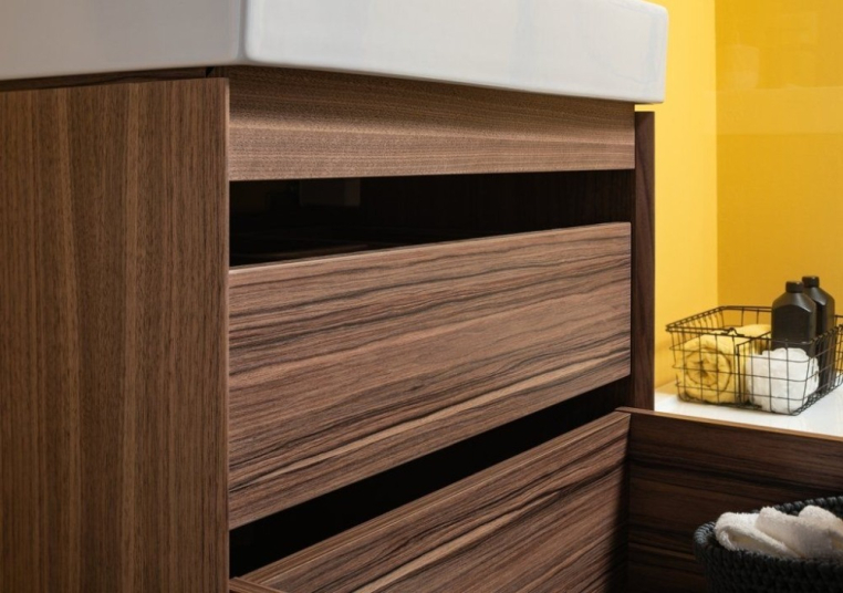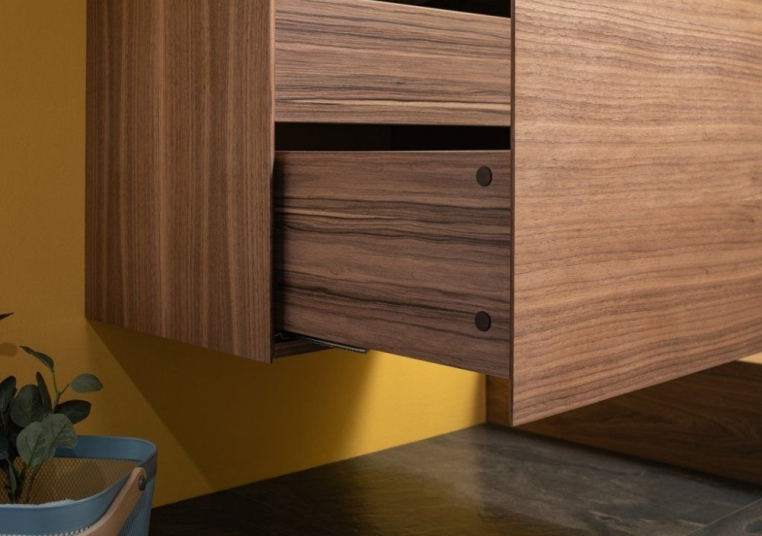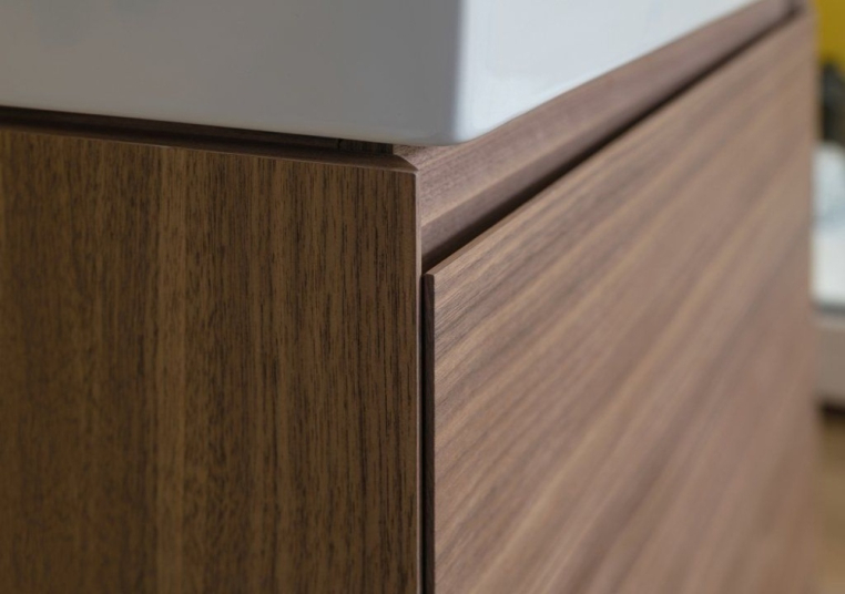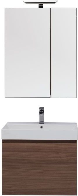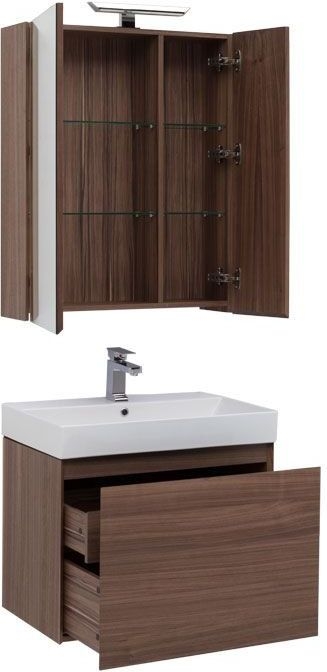 Комплект мебели для ванной Aquanet Нью-Йорк 70 (орех) не нуждается в дополнительных декоративных деталях, живописной фурнитуре – шпон ореха, используемый в качестве покрытия, выполняет функции декорирования наилучшим образом. А для открывания ящичков тумбы торцевые детали фасадов снабжены специальными скосами, что превращает их в удобный элемент открывания. Это и есть так популярные сейчас интегрированные ручки. Система хранения в тумбе шириной 70 см с секретом. Внутри одного большого ящика спрятан еще один – для хранения мелочей, где для правильной организации хранения предусмотрено три отделения: два побольше и одно совсем маленькое. Плавность открывания-закрывания обеспечивает фурнитура немецкой компании Hettich. Белоснежная керамическая раковина Slim Synergy производства турецкой компании Sanovit служит не только неотъемлемой функциональной деталью тумбы, но и ее украшением, настолько изящны и плавны ее линии, необычна форма. Корпус традиционно для мебели Aquanet выполнен из влагостойкой ЛДСП, фасады – из МДФ. Дополнительные места хранения предоставляет зеркальный шкафчик-камерино с двумя фасадами, на которых закреплено зеркальное полотно, предназначенное для использования во влажных помещениях. Тумба имеет универсальный способ установки, то есть ее можно подвесить, а можно и установить на ножки.