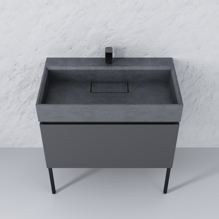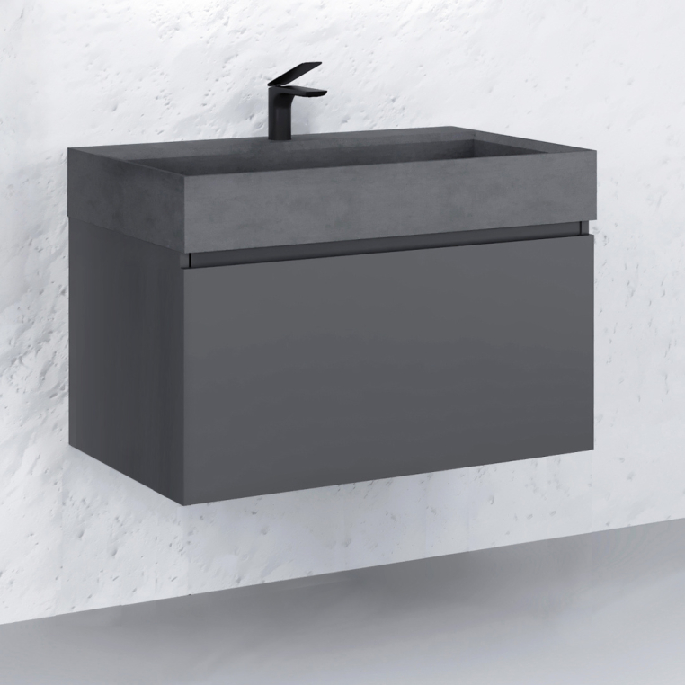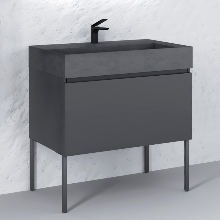 Тумбы коллекции выполнены из МДФ в пленке ПВХ цвета антрацит. Комплекты коллекции оснащены раковинами из бетона