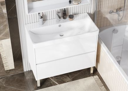 Тумба Сканди 90 выполнена в популярном минималистичном скандинавском стиле. Корпус тумбы выполнен из влагостойкой ЛДСП в белой матовой покраске, а фасады в белой глянцевой покраске. Конструктивно тумба состоит из 2 вместительных ящиков, установленных на направляющие с интегрированной системой push-to-open для комфортного использования. На тумбе нет выступающих деталей и фурнитуры, открытие ящиков реализовано нажатием на фасад. Тумба комплектуется белоснежной раковиной Адриана от бренда Santek. Тумбу по желанию можно использовать в двух вариантах: как подвесную или дополнительно приобрести опоры.