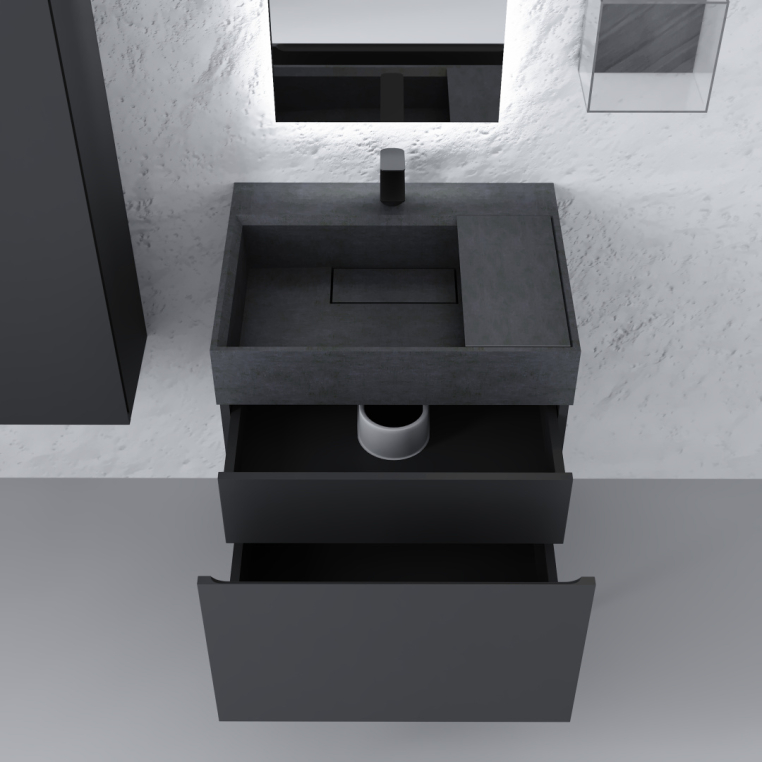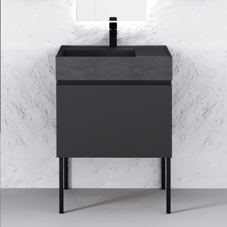 Тумбы коллекции выполнены из МДФ в пленке ПВХ цвета антрацит. Комплекты коллекции оснащены раковинами из бетона