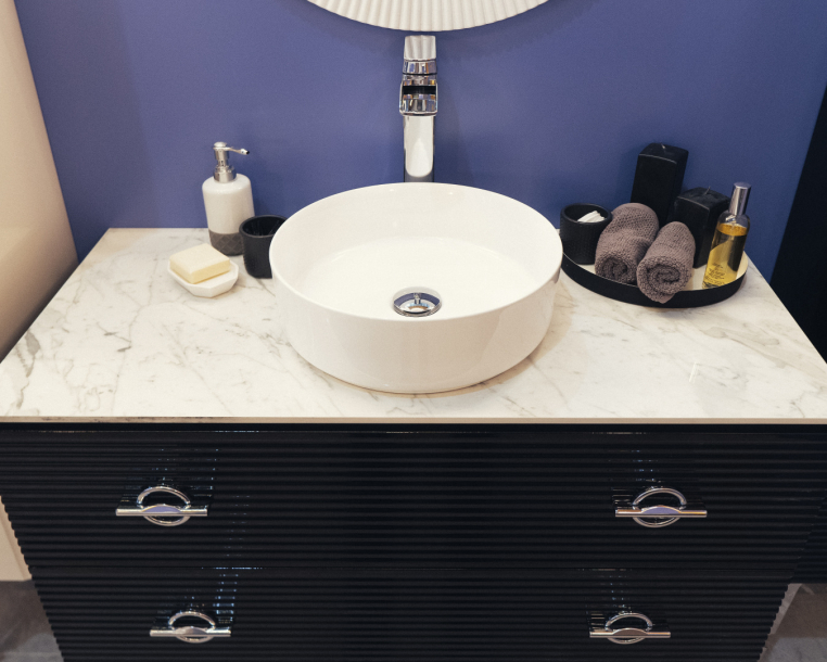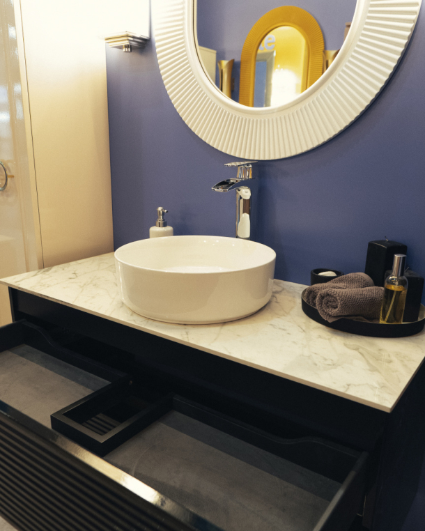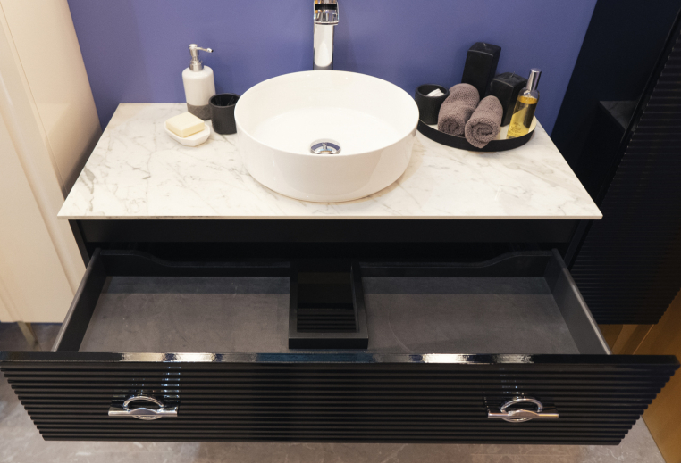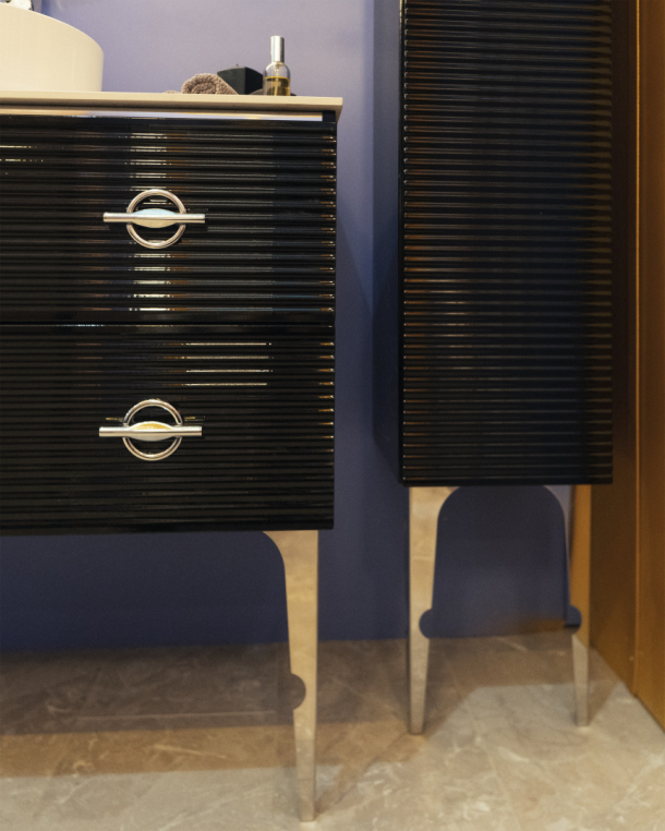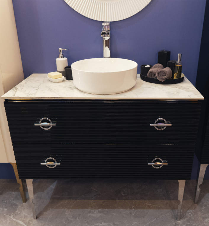 Тумба подвесная, она идет без ножек, но их можно приобрести отдельно (высота ножек 35 см и 45 см). Фурнитура у тумбы в хроме, ножки и ручки покрыты гальваническим способом, ящики с доводчиками. Раковину можно выбрать встраиваемую (моноблок) без столешницы или же со столешницей вместе с накладной раковиной. Столешница может быть выполнена из искуственного камня corian, из керамогранита (biancacarrara, cremanova, neromacqina) и из каленого стекла optiglass.
