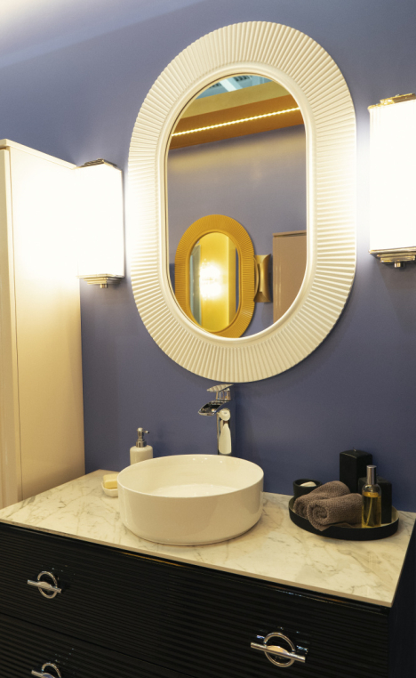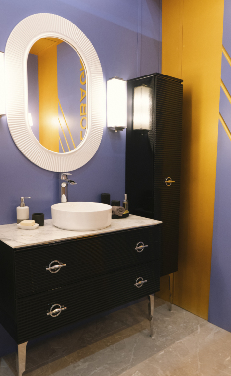 Angelo Bagno исследует современный взгляд на дизайн ванной комнаты. Коллекции представляют собой реализацию творческого путешествия через технические детали и оригинальные формы, вдохновленные четырьмя стихиями огонь - вода - земля -воздух. Коллекция «ARIA» отличается особым дизайном, где ручки напоминают нам парящий авиалайнер. А фасад раскрывает нам ощущение волнообразного потока воздуха, который своими частицами перетекает из низкого давление в высокое.