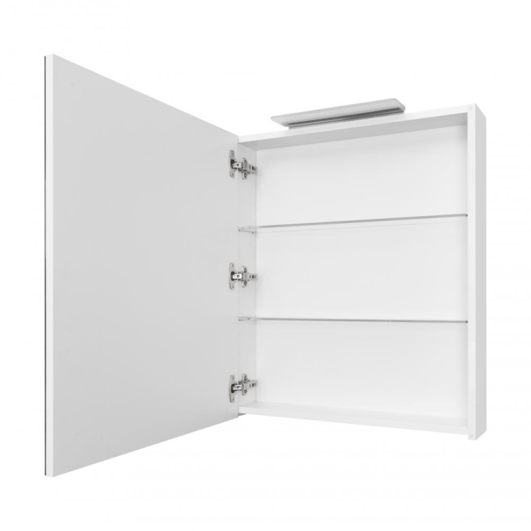 Зеркальный шкаф OLETA оснащен светильником от европейского бренда Ebir с возможностью регулировки положения, IP 44, 5 700 K. Теплота света у светильника 5 700 K – это яркий свет, идеальный для нанесения макияжа и бритья. Положение светильника можно регулировать: наклонить слегка вниз или направить свет повыше. За зеркальными фасадами расположены регулируемые по высоте полочки из просветленного стекла. Фасады оснащены петлями Hettich с плавным закрыванием.