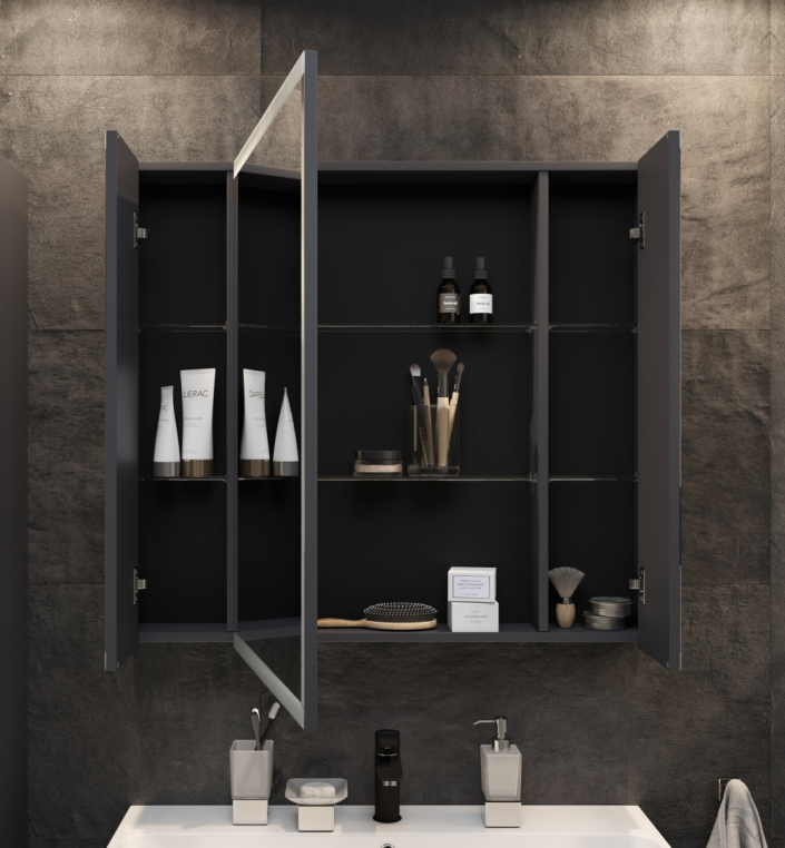 Прямоугольное зеркало-шкаф STWORKI «Кронборг 90» в стиле лофт смотрится брутально и выразительно. В первую очередь стоит отметить необычный оттенок «антрацит» — серый, близкий к черному, который образует стильное и гармоничное сочетание с гладким зеркальным полотном. Дает четкое, без искажений отражение. Система хранения впечатляет — за тремя створками спрятаны девять отделений, больших и маленьких. Дверцы, снабженные механизмом доводчика, закрываются плавно и бесшумно. Корпус, выполненный из ламинированной ДСП, не боится влаги. Комплектация продумана до мелочей и включает крепкие металлические подвесы.