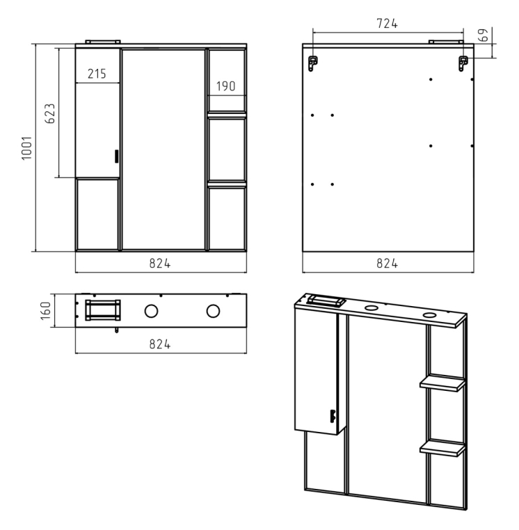 Оснащение зеркала: зеркало с подсветкой, зеркало с розеткой, розетка и выключатель внутри шкафчика