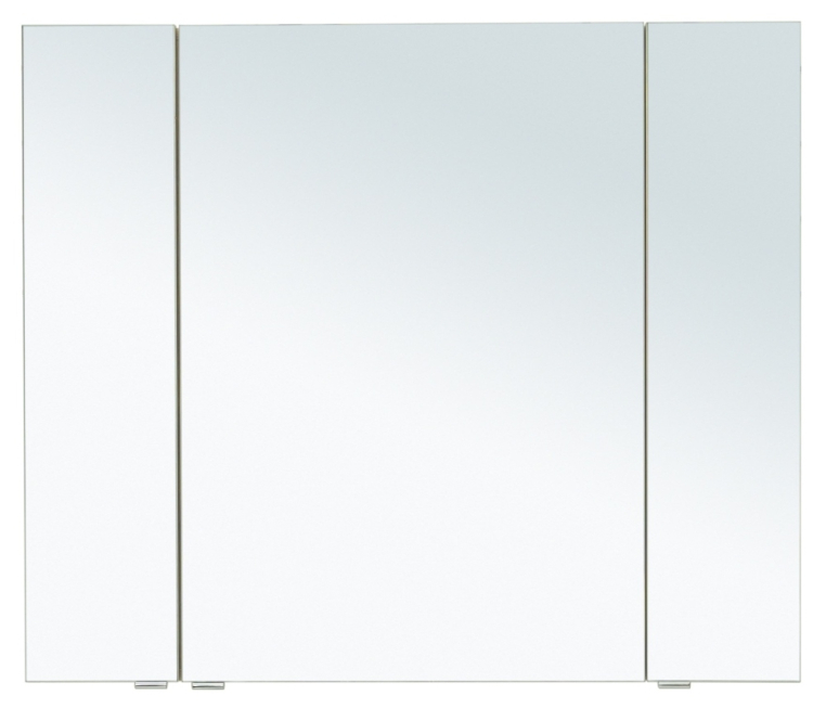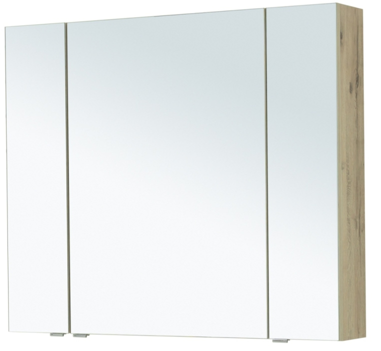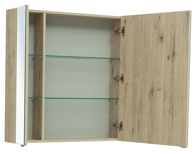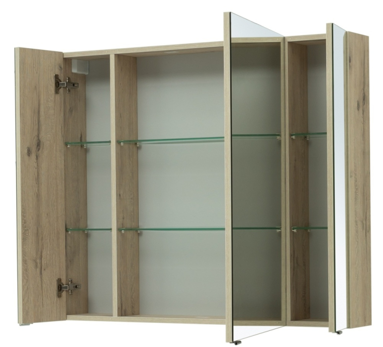 Зеркальный шкаф Aquanet «Алвита» New 100 в цвете «дуб веллингтон белый». Корпус изготовлен из ЛДСП, устойчивой к эксплуатации в условиях высокой влажности. Фасады выполнены из МДФ. Количество распашных дверей — три. Внутреннее пространство используют как дополнительное место хранения для небольших предметов — ватных палочек и спонжей, бритвы и зубных щеток.