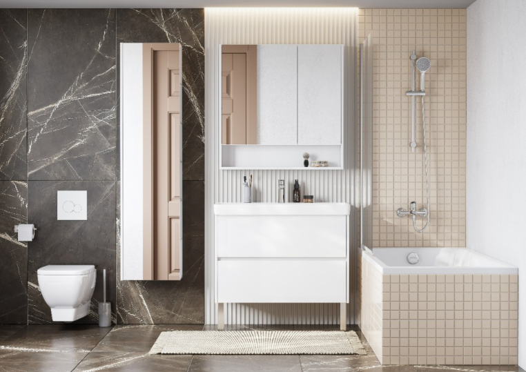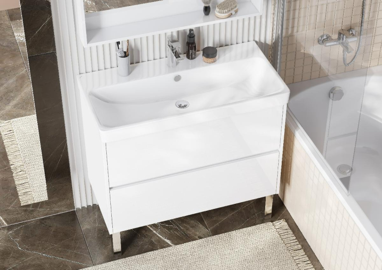 Тумба Сканди 90 выполнена в популярном минималистичном скандинавском стиле. Корпус тумбы выполнен из влагостойкой ЛДСП в белой матовой покраске, а фасады в белой глянцевой покраске. Конструктивно тумба состоит из 2 вместительных ящиков, установленных на направляющие с интегрированной системой push-to-open для комфортного использования. На тумбе нет выступающих деталей и фурнитуры, открытие ящиков реализовано нажатием на фасад. Тумба комплектуется белоснежной раковиной Адриана от бренда Santek. Тумбу по желанию можно использовать в двух вариантах: как подвесную или дополнительно приобрести опоры.