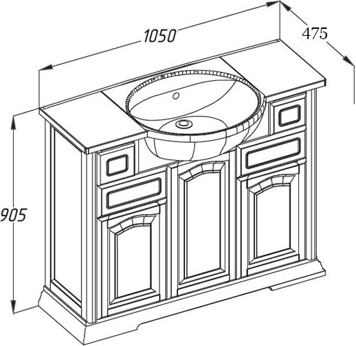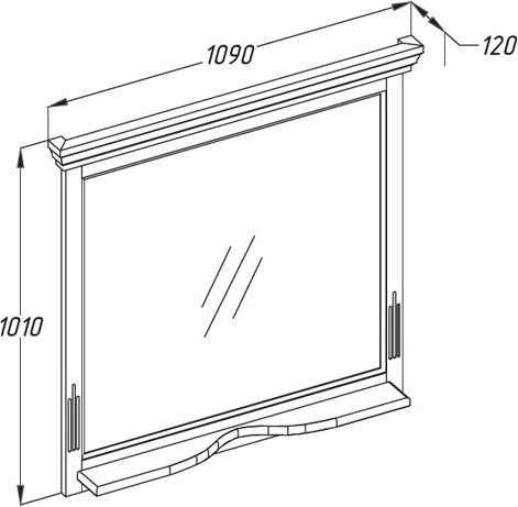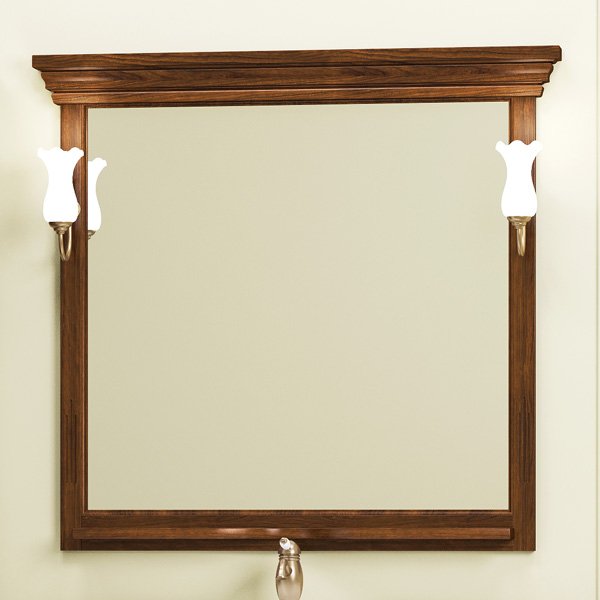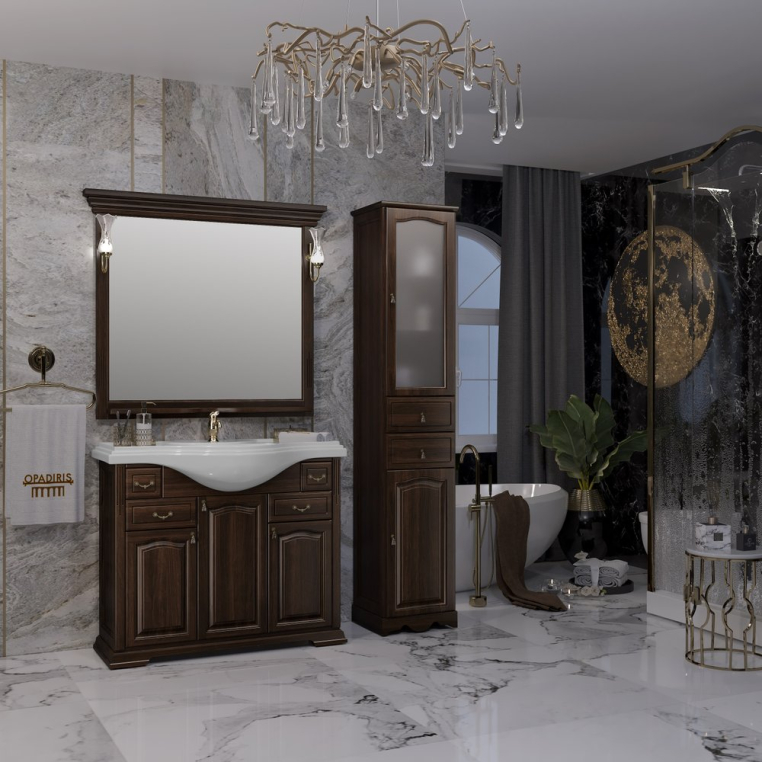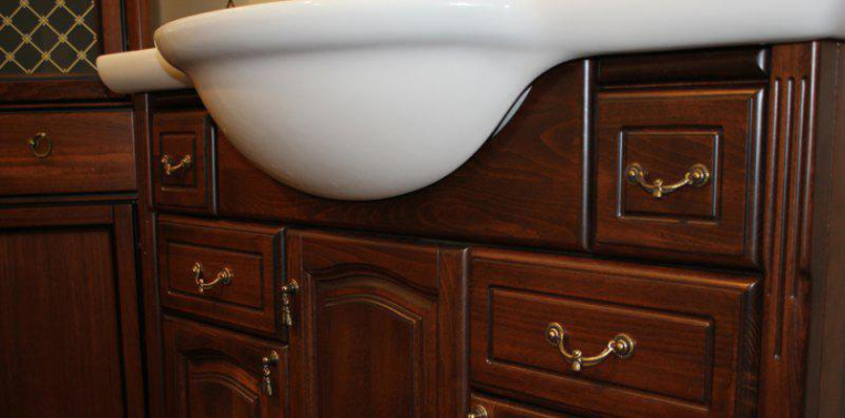 Респектабельный гарнитур «Риспекто» – идеальное решение по меблировке просторной ванной комнаты. Массивный комплект изготовлен из бука с матовым покрытием темно-коричневого цвета, передающим неповторимую текстуру дерева. Темный оттенок контрастирует с белизной глубокой фаянсовоой раковиной с широкой столешницей. Резные фасады тумбы украшены изящными бронзовыми ручками. Эргономично организованное внутреннее пространство позволяет спрятать в выдвижных ящиках и за распашными дверями с интегрированными доводчиками все необходимые в ванной комнате вещи.Их безупречное функционирование обеспечивают европейские комплектующие. Зеркало в деревянной раме с широким карнизом, напоминающим античный, оснащено полочкой для аксессуаров. Надежные кронштейны входят в комплект