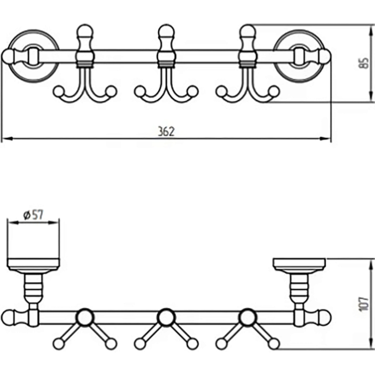 Планка с 3-мя крючками серии MIRELLA бренда MIGLIORE — многофункциональный аксессуар, который можно использовать в ванной комнате, в сауне, на кухне, в коридоре, кладовке. Общая длина составляет 36 см, 3 крючка классической формы расположены на достаточном удалении друг от друга, что позволит удобно разместить любые вещи и большие полотенца.