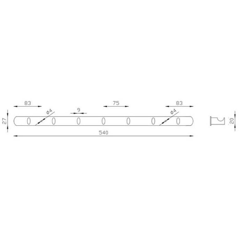 Вешалка с семью крючками. Изготовлена из Zamac (сплав цинка, алюминия, магния и меди) с глянцевой поверхностью. Размеры: 27 мм в высоту, 540 мм в ширину и 45 мм в глубину.