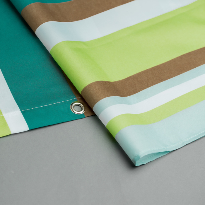 Материал: текстиль, 100% полиэстер, водоотталкивающая пропитка, кольца в комплекте c системой Click, упаковка ПВХ пакет, плотность 110 г/м, 12 металл. Люверсов. Упаковка ПП пакет