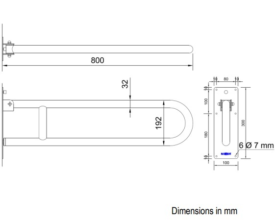 Опорный поручень длиной 800 мм NOFER 15051.SP.80.W, белый глянец, стальной, без крючка для туалетной бумаги, откидной.