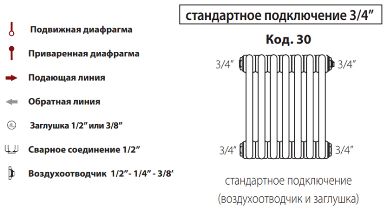 - Характеристики бокового подключения: 4 патрубка 3/4"