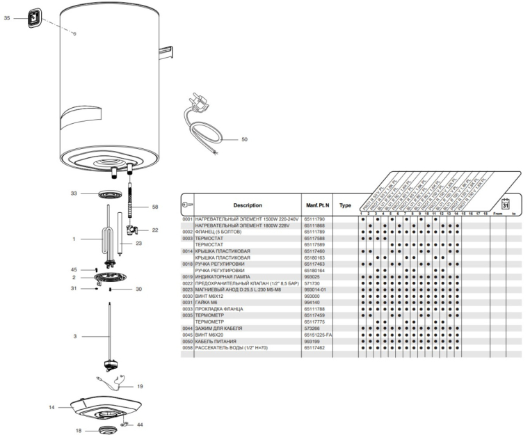 Теплоизоляция водонагревателя выполняется из полиуретана и обеспечивает минимальные потери тепла в режиме сохранения горячей воды. Встроенный регулятор температуры позволяет задавать желаемую температуру нагрева воды. А встроенный термостат контролирует температуру нагрева воды внутри бака. Магниевый анод обеспечивает дополнительную защиту внутреннего бака от коррозии. Сам внутренний бак выполняется из нержавеющей стали с антикоррозионным покрытием. Для нагрева воды применяется встроенный трубчатый электрический нагревательный элемент ТЭН, который преобразует электрическую энергию в тепловую. Благодаря применению нагревателя высокой мощности обеспечивается быстрый нагрев воды внутри бака. Внешний корпус белого цвета выполняется из металла. Форма водонагревателя – цилиндрическая узкая.