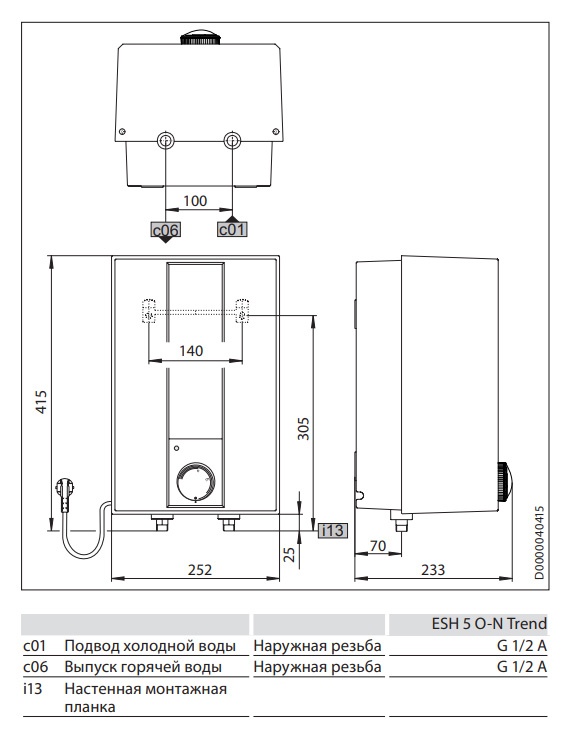 Внешний вид Stiebel Eltron ESH 5 O-N Trend + tapВодонагреватель Stiebel Eltron ESH 5 O-N Trend + tap – это безнапорное накопительное устройство с нижней подводкой для монтажа над раковиной и подключения для одной водоразборной точки. Как правило, водонагреватель устанавливается либо над смесителем на кухне, либо в ванной комнате. Компактные габариты оборудования позволяют помещать его в закрытый шкаф. Модель имеет объем бака 5 литров и обеспечивает моментальную подачу горячей воды при открытии крана. ESH 5 O-N Trend + tap может использоваться только совместно со специальной смесительной арматурой, которая входит в комплект поставки. Небольшой вес модели без учета жидкости составляет всего 3,1 кг. За счет температурной регулировки на выходе можно получать от 35° до 85°C, а близкое расположение к точке разбора снижает теплопотери воды при прохождении пути от накопительного бака до крана.