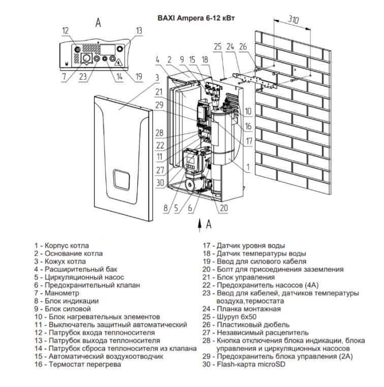 Электрический котел BAXI AMPERA – это умная миникотельная, так как внутри установлен насос, расширительный бак и группа безопасности. Блок панели управления предусматривает работу с каскадом котлов, бойлером ГВС и несколькими контурами, в том числе с контуром «теплые полы» со смесительным трехходовым клапаном. В модели имеется погодозависимое управление.