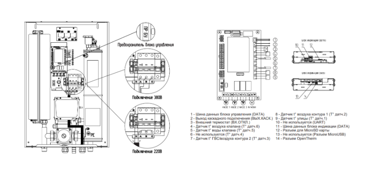 - Блок питания электроники котла имеет встроенную стабилизацию напряжения и систему защиты от импульсных помех и работает в диапазоне входных напряжений 85-305 В