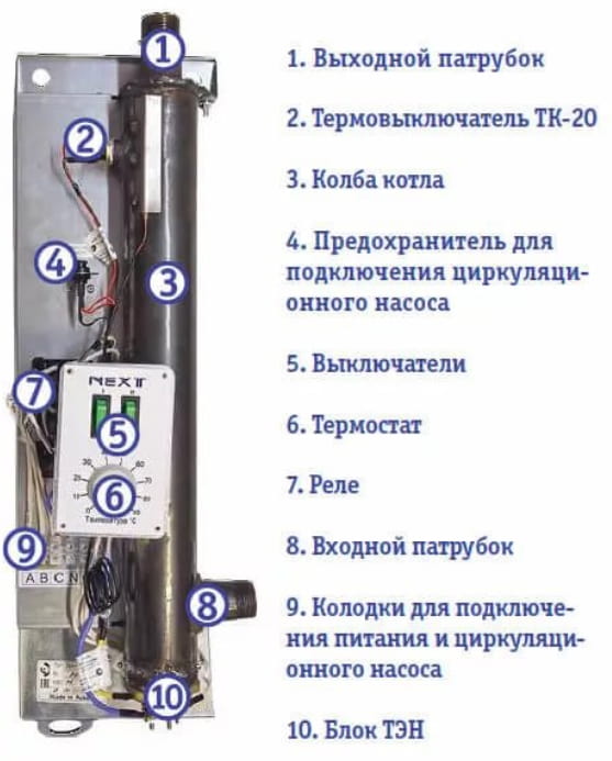 ТЭНы котла Эван Next, как и всех без исключения электрокотлов Эван, сделаны из нержавеющей стали, что повышает срок их службы. Кроме того, в котлах Next реализована блочная конструкция ТЭН на резьбовом соединении, что позволяет существенно упростить его замену. Для работы в системах с принудительной циркуляцией электроотопительный котел Эван Next имеет колодку для подключения циркуляционного насоса. А котлы, выпускаемые после 2018 года, оснащены колодкой для подключения внешнего термостата или модуля дистанционного управления Эван GSM/Wi-Fi Climate. Надежность оборудования в совокупности с невысокой ценой представляют агрегат, уникальный в своем классе.