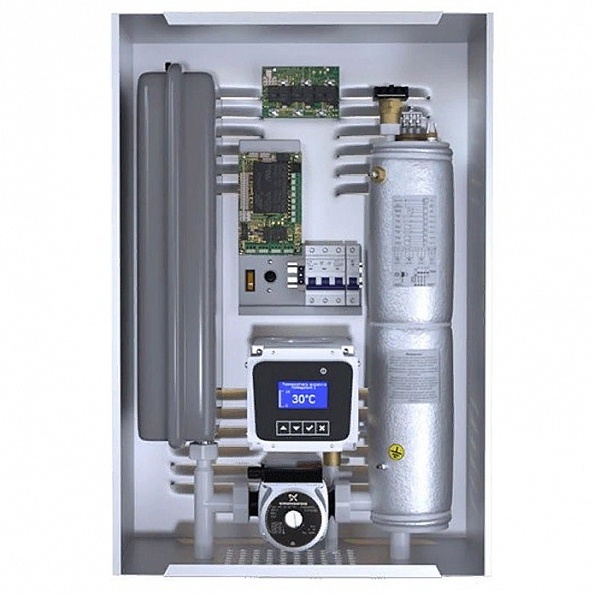 Электрический котел BAXI AMPERA – это умная миникотельная, так как внутри установлен насос, расширительный бак и группа безопасности. Блок панели управления предусматривает работу с каскадом котлов, бойлером ГВС и несколькими контурами, в том числе с контуром «теплые полы» со смесительным