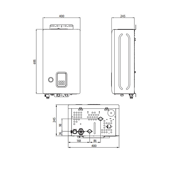 Комплект поставки: котел (1 шт.), паспорт (1 шт.), руководство пользователя (1 шт.), гарантийный талон (1 шт.), дюбель-гвоздь (2 шт.), шланг (1 шт.).