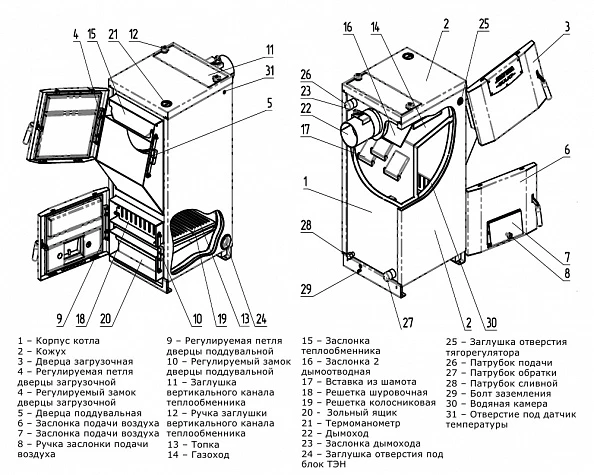Котел оснащен системой подачи вторичного воздуха, установлен термометр, измеряющий температуру подачи воды.