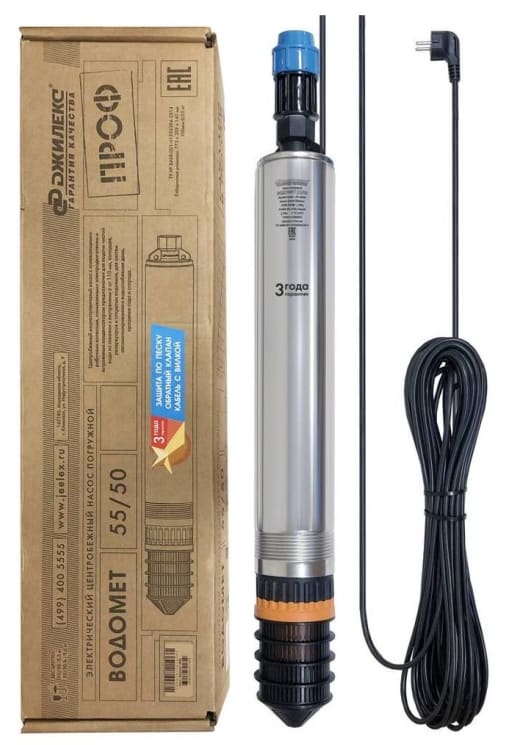 Насос скважинный «Водомет» Джилекс 55/35 Проф электрический центробежный погружной предназначен для подачи чистой воды из скважин, колодцев, резервуаров и открытых водоемов, для систем автоматического водоснабжения дома, орошения сада и огорода. «Водомет» отличается высокой надежностью, неприхотливостью, экономичностью, имеет высокий коэффициент полезного действия. Электродвигатель насоса надежной защищен от перегрева потоком омывающей его жидкости, которая проходит по кольцевому зазору между оболочкой статора и корпусом насоса. «Водомет» оснащен «плавающими» рабочими колесами, которые способны пропускать большие по величине частицы.