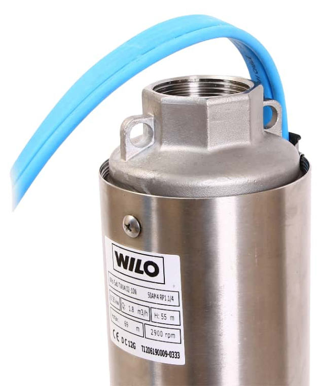 В комплекте с насосом поставляется соединительный кабель с разрешением к применению в питьевом водоснабжении (поперечное сечение – 4х1,5 кв. мм). Однофазные двигатели поставляются с распределительными пусковыми устройствами с конденсатором, термическим реле, а также включателем-выключателем. Насосы серии TWU способны перекачивать чистую воду температурой от +3 до +30 оС, подключение осуществляется через резьбу G 1"1/4 или G 2", класс защиты насоса – IP68.