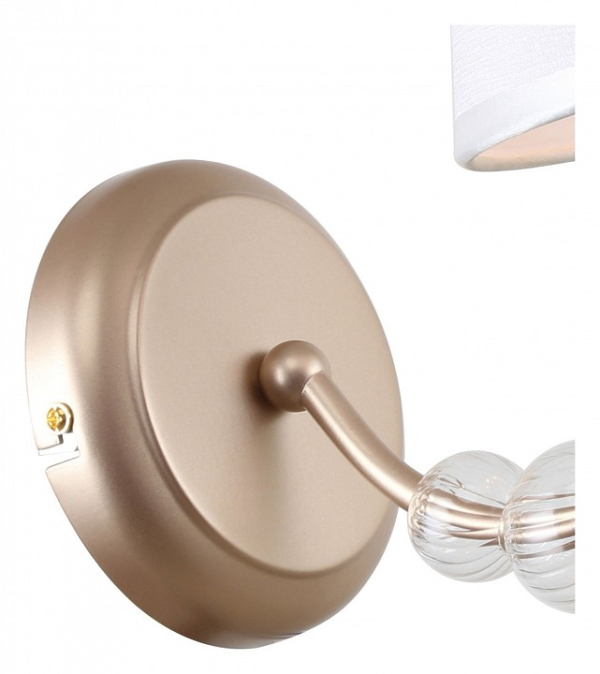 Форма плафона конус круглый усеченный, цвет плафона белый, цвет арматуры золото, неокрашенный. Лампы в комплекте: отсутствуют. Светильник имеет слабую защиту от влаги и пыли — IP20 и предназначен для использования в домашних интерьерах с умеренной влажностью.