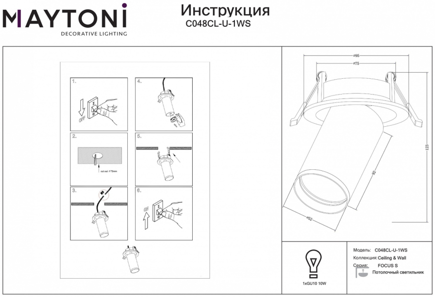 Изделие C048CL-U-1WS от немецкого бренда Maytoni относится к коллекции Ceiling & Wall и отлично подойдет для установки на низкий потолок кухни, оформленной в стиле модерн. Встраиваемый спот Maytoni Technical Focus S C048CL-U-1WS с цилиндрическими плафонами осветит помещение площадью 5 кв.м. Для устройства рекомендуется использовать светодиодные лампы с цоколем GU10 и мощностью 10 W. Основными материалами для производства используется металл и алюминий и может использоваться для натяжного потолка. Преимущественно представляется в цвете Матовое серебро, Белый и Матовым серебром.