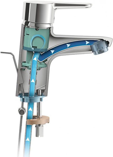 - Металлическая рукоятка с индикаторами горячей/холодной воды