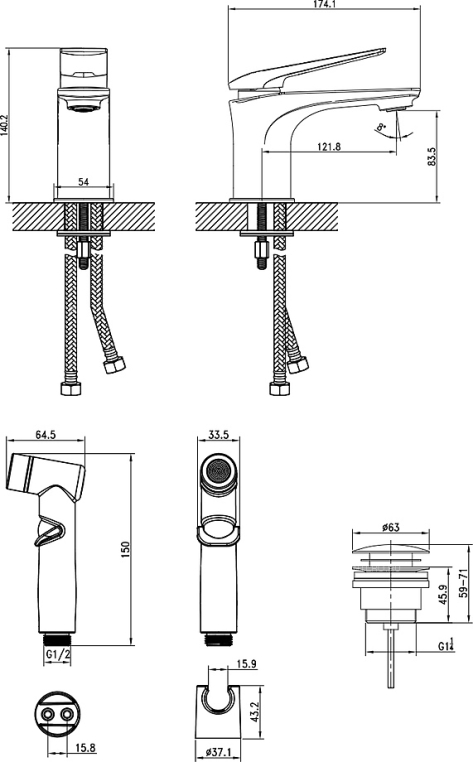 Аксессуары в комплекте: лейка гигиенического душа с регулятором напора воды, душевой шланг 1,5 м с функцией вращения лейки без перекручивания, настенное крепление для лейки