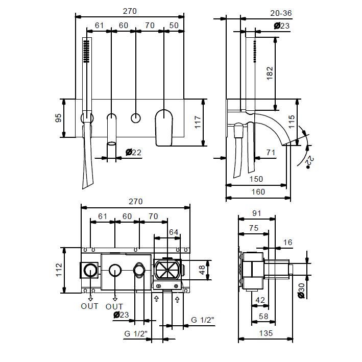 Встраиваемый смеситель для ванны Fantini MYO 6102V621B наружняя часть, хром