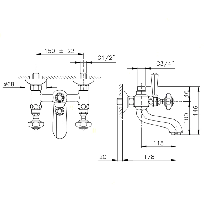 Смеситель для ванны на 2 отверстия, с переключателем ванна/душ, вывод сверху 3/4; (для душ. стойки), цвет: бронза